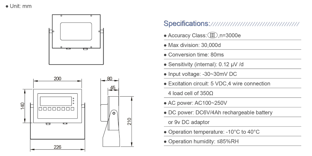 A UV protected high strength PBT digital weigh indicator with rechargeable 6V battery is included with metal shield PVC cable with IP67 rated quick release connectors - User Manual view here